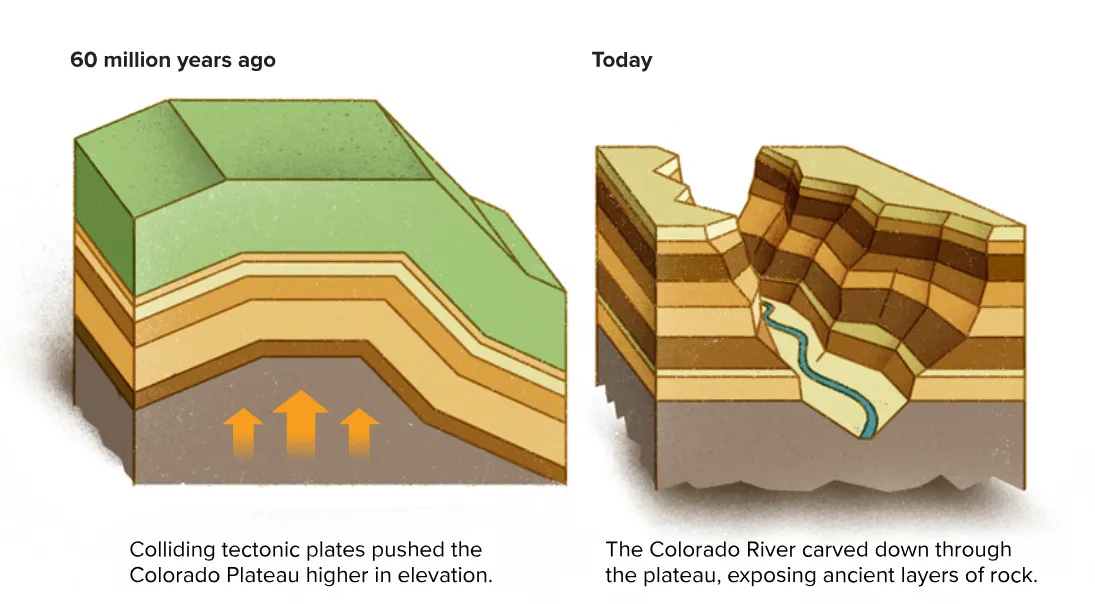 In the case of the Grand Canyon, it was formed over millions of years through tectonic movements and the erosive actions of the Colorado River, gradually carving through layers of rock to create the geological spectacle we see today.